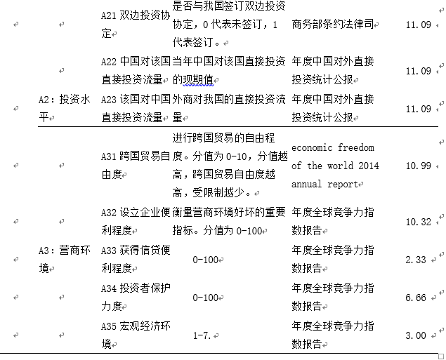 各指标数据从《全球竞争力报告》、《全球营商环境报告》《世界经济自由度报告》、《国别投资指南》、《年度中国对外直接投资统计公报》等报告或文件中提取出来。测算数据主要有三个来源: 各国政府统计机构、国际性统计机构、国际性研究机构或公司的主题报告和调查数据。由于“一带一路”贸易畅通指标体系中的各项指标数据的量纲不同,所有指标数据都必须进行无量纲化处理。