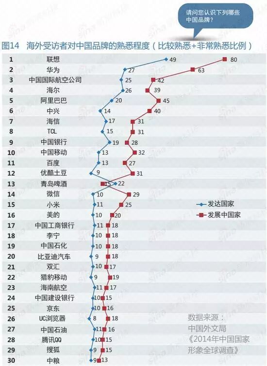 从熟悉程度来看,海外民众最熟悉的中国品牌排在前十位的依次为联想、华为、中国国际航空公司、海尔、阿里巴巴、中兴、海信、TCL、中国银行和中国移动。