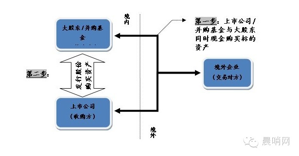 同样采用两步走,第一步是由大股东或并购基金与上市公司同时收购境外标的资产,通常上市公司先参股,以保证上市公司的收购不构成重大资产重组。第二步,上市公司再通过发行股份购买资产的方式将境外标的资产全部注入上市公司。具体交易方案如下: