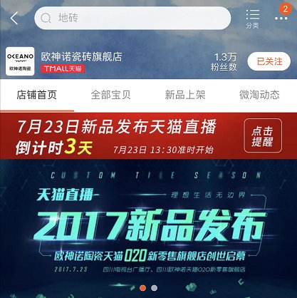 打开天猫APP——搜索“欧神诺瓷砖旗舰店”——点击提醒