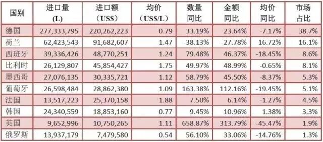 1-10月,我国进口啤酒总量为5.5亿升,进口额5.7亿美元,同比分别增长17.0%和12.8%。前三大对华出口国仍为为德国、荷兰、西班牙。其中,荷兰延续着今年以来的跌势,德国稳中有涨,西班牙增速较快。此外,数据中比较亮眼的当属葡萄牙和英国。