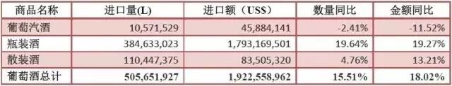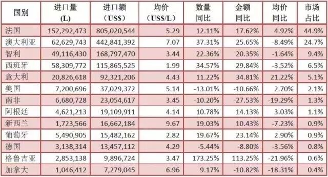 从上表可以看出,瓶装酒继续领跑前行,散装酒小幅上扬,葡萄汽酒仍显颓势。瓶装酒进口额17.9亿美元,同比增长19.3%,在葡萄酒进口总额中占比高达93.3%。瓶装葡萄酒牢牢把持着头把交椅的位置,且上行趋势平稳,这与国人对其日渐加深的认可与喜爱密不可分,进口瓶装酒市场向好态势日益稳固。